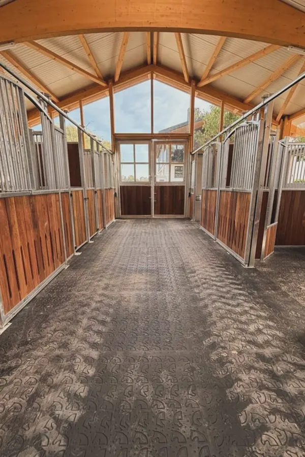 Hell, luftig und trittsicher zeigt sich der neue Stall. Alle Verkehrsflächen, wie auch die Boxen sind mit Gummimatten ausgelegt. Neben zwei großzügigen Waschplätzen mit warmem Wasser erwartet den Reiter eine große und lichtdurchflutete Sattelkammer.